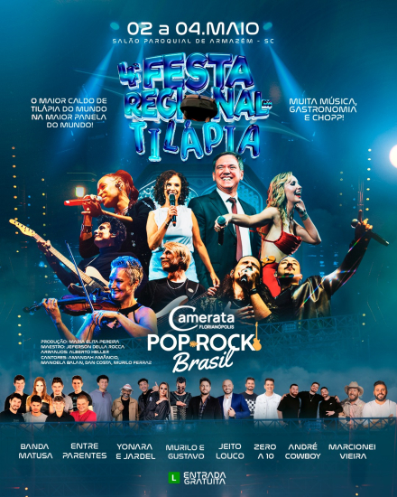 A cidade de Armazém, no Sul de Santa Catarina, já está em contagem regressiva para mais uma edição da tradicional Festa Regional da Tilápia, que será realizada entre os dias 2 e 4 de maio de 2025, em frente ao Salão Paroquial. O evento, com entrada gratuita e classificação livre, promete movimentar a cidade com shows, feira, gastronomia típica e atrações para todas as idades.