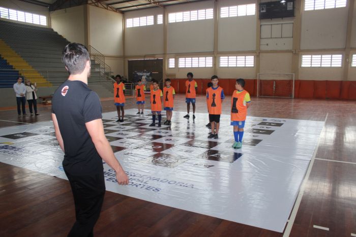 A novidade foi apresentada hoje, na quadra do Ginásio Juan Manuel dos Santos, pela equipe da Secretaria de Desenvolvimento Econômico, Esporte, Cultura, Turismo e Tecnologia, em uma partida de exibição. O tabuleiro tem sete metros por sete e as peças usadas são humanas distribuídas em uma lona de 9x9. O capitão de cada time (do lado de fora) fica responsável em decidir as jogadas, mas sempre alinhado com os jogadores, cada um buscando o melhor xeque-mate neste xadrez indoor.
