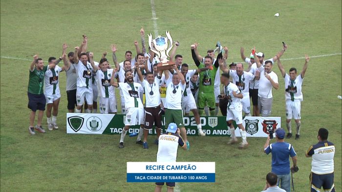 Jogadores do Recife comemoraram muito no final do jogo com a taça na mão. Foto: Divulgação Depois de um longo período de campeonato devido a pandemia do Covid-19, a final da Taça Tubarão 150 anos que começou em 2020, terminou hoje com uma grande final entre Recife e Olimpikus, do bairro Passagem. O campeonato municipal agora tem um novo campeão, a equipe do Recife venceu com cinco gols o Olimpikus, que marcou duas vezes.