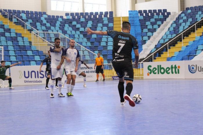 Ferrugem abriu o placar aos 14 minutos do primeiro tempo e Eduardo Jabá ampliou aos 19. No segundo tempo, Jedi marcou o terceiro aos oito minutos. Ribeiro, duas vezes, descontou para os visitantes, aos 18 e 19, finalizando o placar. Henrique, Ferrugem, Pixote, Eduardo Jabá e Maico iniciaram a partida pela equipe da casa. Também entraram na quadra Marcinho, Pastega, Júlio, Caetano, Vini Scola, Jedi, Ernandes, João Pedro e Biel.