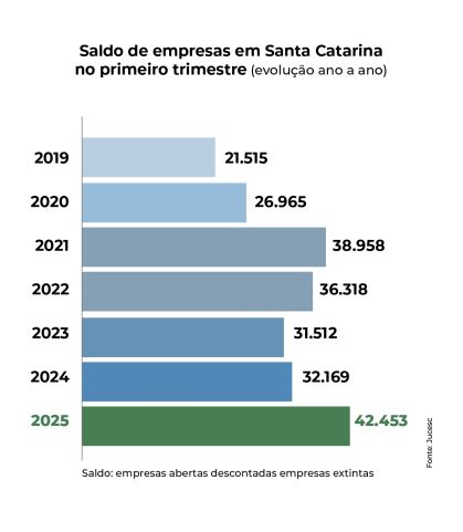 Segundo dados divulgados pela Junta Comercial do Estado de Santa Catarina (Jucesc), o saldo representa a diferença entre 83.541 constituições e 41.088 extinções de empresas no período.