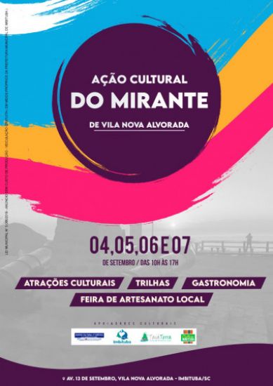 A Ação Cultural é uma parceria entre o Governo Municipal e a Associação Cultural e Carnavalesca Mariscão da Zimba. Foto: Divulgação A Prefeitura de Imbituba, através da Superintendência Municipal de Cultura, fará, a partir de hoje até a próxima terça-feira, dia 7, mais uma edição do projeto “Ação Cultural”. Desta vez, o evento será em dos locais mais admirados da cidade: o Mirante do bairro Vila Nova Alvorada (Divinéia).