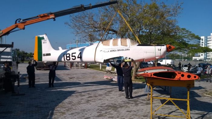 O avião, modelo Neiva T-25 Universal, fora de operação há vários anos, veio do parque de material aeronáutico da FAB em Lagoa Santa (MG).
