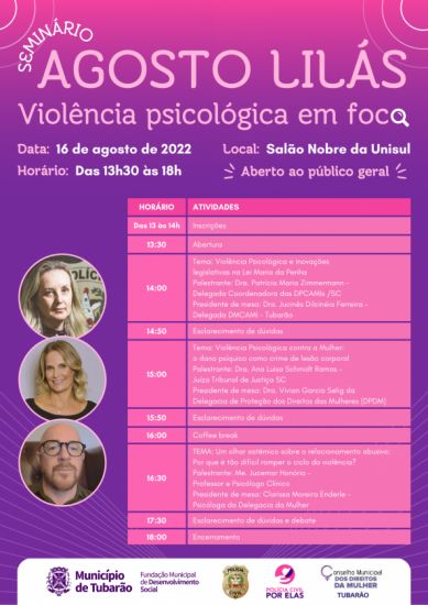 O seminário, aberto ao público geral, trará palestras envolvendo temas como a violência psicológica contra a mulher. Foto: Divulgação No próximo dia 16, no Salão Nobre da Unisul, ocorre a partir das 13h30, o Seminário Agosto Lilás – Violência Psicológica em Foco - evento realizado pela Fundação Municipal de Desenvolvimento Social (FMDS), Delegacia de Proteção à Criança, Adolescente, Mulher e Idoso de Tubarão (DPCAMI) e Conselho Municipal dos Direitos da Mulher. O seminário, aberto ao público geral, trará palestras envolvendo temas como a violência psicológica contra a mulher. O Agosto Lilás é uma campanha de enfrentamento à violência doméstica e familiar contra a mulher.
