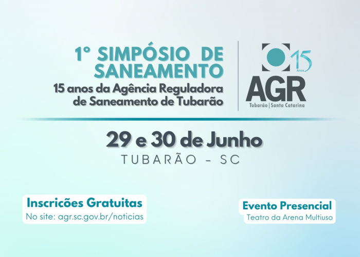 A Agência Reguladora de Saneamento de Tubarão (AGR), criada para fiscalizar os serviços de abastecimento de água e esgoto, está comemorando 15 anos de atividades neste mês. E, para celebrar essa importante marca, a agência promoverá o 1º Simpósio de Saneamento nos dias 29 e 30, no Teatro da Arena Multiuso Prefeito Estêner Soratto da Silva.