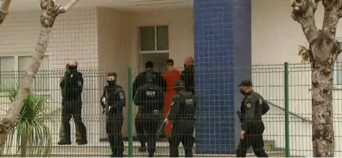 O rapaz chegou escoltado pela polícia penal e as ruas em torno do fórum foram bloqueadas. Foto: Divulgação No fim da audiência em que foi ouvido o rapaz de 18 anos acusado de matar cinco pessoas em uma creche em Saudades, no Oeste catarinense, a Justiça aceitou o pedido feito pela defesa dele, que alegou insanidade mental do réu. Ele será transferido para um hospital psiquiátrico em Florianópolis, onde passará por avaliação.