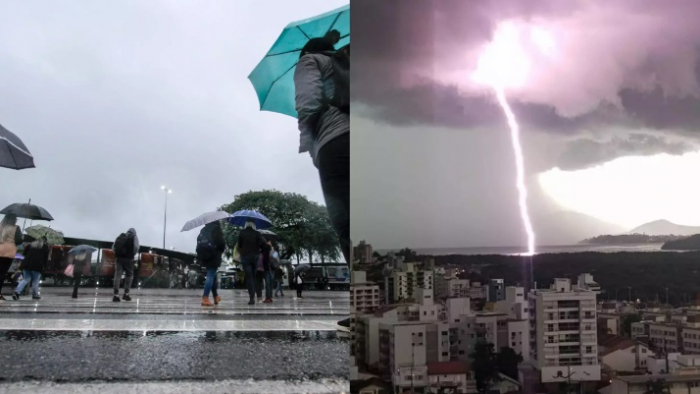 Com a atuação de ciclone extratropical promete trazer chuvas e temporais isolados em algumas regiões de Santa Catarina. – Foto: Montagem/Reprodução/ND A presença de um ciclone extratropical em alto mar está gerando alerta para chuvas e temporais em Santa Catarina, conforme informa a Defesa Civil. Embora o dia comece com tempo firme devido à alta pressão, a atuação desse fenômeno, combinada com o calor, pode resultar em pancadas de chuva e temporais isolados, especialmente entre os Planaltos e o Litoral Catarinense durante a tarde e noite.