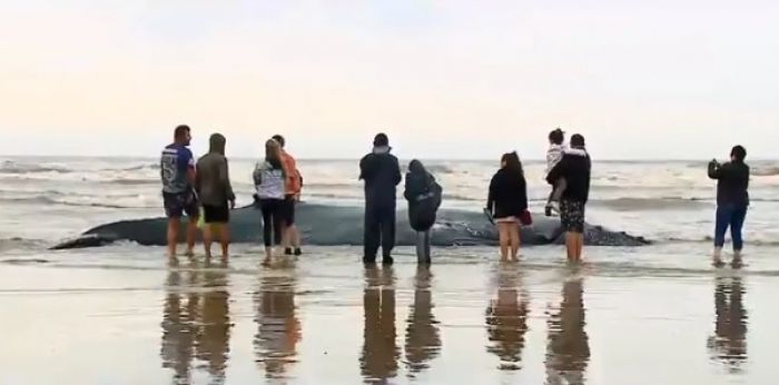 Moradores observam a baleia que já não tem mais forças para voltar as águas. Foto: Divulgação A baleia jubarte de aproximadamente 11 metros segue encalhada na praia de Esplanada em Jaguaruna. O animal foi visto por um morador na manhã de quarta-feira (5) e foram feitas manobras para que ele voltasse ao fundo do mar. Como não houve sucesso, os biólogos decidiram, nesta quinta (6), pela eutanásia da baleia. Veja a tentativa dos moradores de desencalhar a baleia.