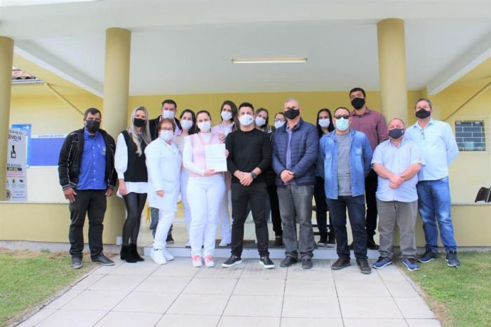 São R$ 100 mil em investimentos nos ESF's de Braço do Norte. Foto: Divulgação Encerrando a segunda semana de ações do Calhamaço de Obras, foram entregues na última sexta-feira, a autorização para fornecimento de equipamentos para unidades de saúde de Braço do Norte. O ato ocorreu no ESF Rio Bonito. O prefeito, Beto Kuerten Marcelino, aproveitou a oportunidade para agradecer a equipe do ESF do Rio Bonito por toda a dedicação à comunidade.