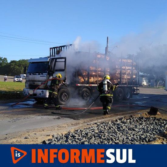 O Corpo de Bombeiros de Forquilhinha foi acionado e se deslocou até o local, onde combate as chamas que estava na cabine, se dissipando para a carga de toras de pinos.