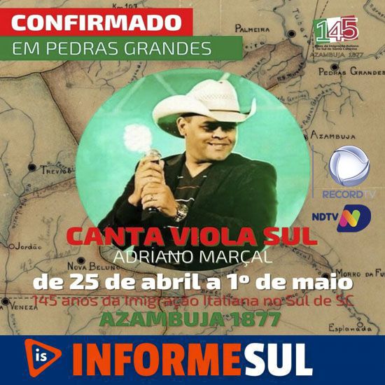 A Prefeitura Municipal de Pedras Grandes lançou neste sábado (19), às 11h a programação oficial da comemoração dos 145 anos da Imigração Italiana no Sul de Santa Catarina. Uma série de eventos será realizada de 25 de abril à 1 de maio no distrito de Azambuja, que foi o berço da colonização com a chegada dos primeiros imigrantes vindos da Itália em 1877.