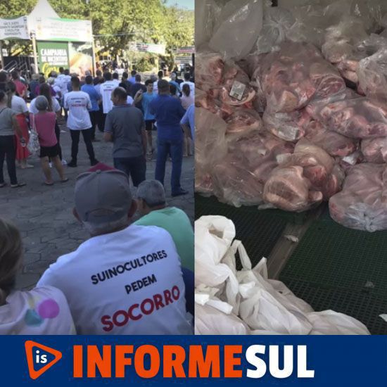 Pedaços de carne de mais de 100 suínos foram distribuídos de graça na manhã desta terça-feira (29) em Braço do Norte, Sul catarinense, região que concentra 40% dos suinocultores independentes do estado.