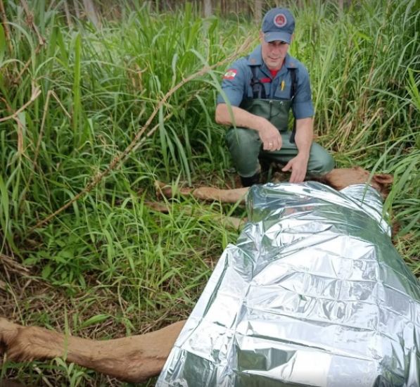 Para o resgate, socorristas usaram cabos de salvamento, cintas e um guincho para a remoção do animal. Ele foi envolvido com uma manta de alumínio para manter a temperatura corporal e entregue a uma veterinária na propriedade.