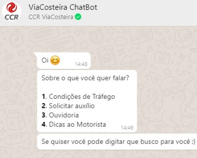 Nesta nova ferramenta, o atendimento é feito por meio de inteligência artificial, que, a partir da interação com o cliente, fornece as informações solicitadas pelos usuários ou direciona para um atendente do Centro de Controle Operacional (CCO), que dará continuidade ao atendimento por meio do próprio WhatsApp. “Em situações onde há urgência, o nosso atendente humano, que está no Centro de Controle Operacional da CCR ViaCostera, assume o imediatamente o atendimento, estratégia que adotamos para diminuir o tempo de espera do usuário”.