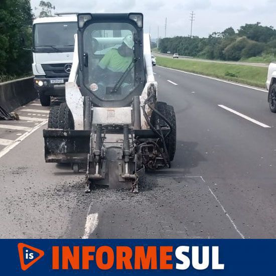 Imbituba: correções emergenciais localizadas no pavimento entre os kms (268 e 270) e (290 e 292) – pista sentido norte; (274 e 276) – pista sentido sul e (271) – no acostamento sentido sul. Entre 7:00h e 17h