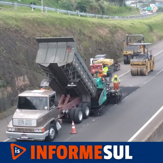 Laguna / Pescaria Brava: correções emergenciais localizadas no pavimento entre os kms (316 e 318) – pista sentido norte. Entre 7:00h e 17h.