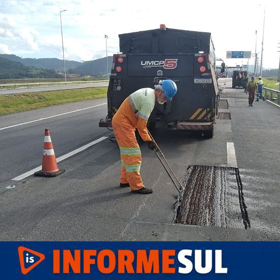 Laguna / Pescaria Brava: correções emergenciais localizadas no pavimento entre os kms (316 e 318) – pista sentido norte. Entre 7:00h e 17h.
