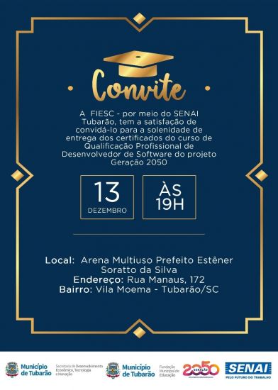 O Programa Geração 2050 teve início em 2018, quando contemplou 41 alunos da rede municipal de ensino. Foto: Divulgação A prefeitura, através da secretaria de Desenvolvimento Econômico, Tecnologia e Inovação e da Fundação Municipal de Educação, e a Fiesc, por meio do Senai de Tubarão, realizarão, no próximo dia 13, a solenidade de entrega dos certificados do curso de Qualificação Profissional de Desenvolvedor de Software do projeto Geração 2050.