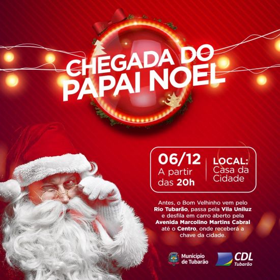 Diversas atrações culturais estão programadas para a chegada do bom velhinho e durante todos os dias. Foto: Divulgação Para marcar o início das celebrações de Natal, assim como o horário especial do comércio em Tubarão, a prefeitura e a Câmara de Dirigentes Lojistas (CDL) promovem, na próxima segunda-feira, dia 6, a Chegada do Papai Noel, a partir das 20 horas, na Casa da Cidade.
