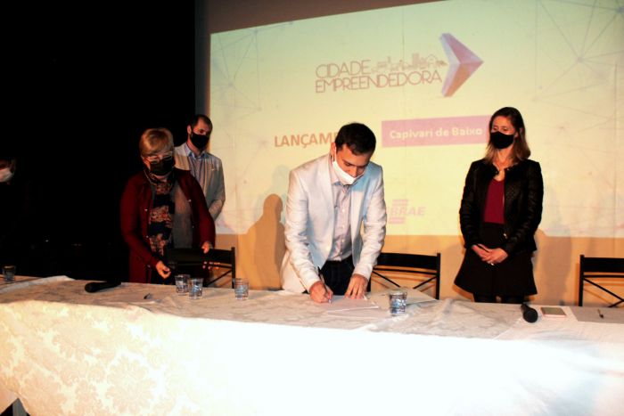 O município será contemplado também com soluções para a gestão pública e transformação econômica por meio da implantação de políticas de desenvolvimento em eixos estratégico. Foto: PMCB Capivari de Baixo aderiu, na noite desta quinta-feira (5), ao Programa Cidade Empreendedora, desenvolvido pelo Sebrae/SC. O ato de lançamento ocorreu no Teatro do Parque Ambiental Encantos do Sul, com a participação de diversas autoridades do Executivo, Legislativo e do Sebrae, além de empresários e alguns moradores. Houve controle no acesso, conforme vigência de todas as normas sanitárias atuais, além de distanciamento social na plateia.