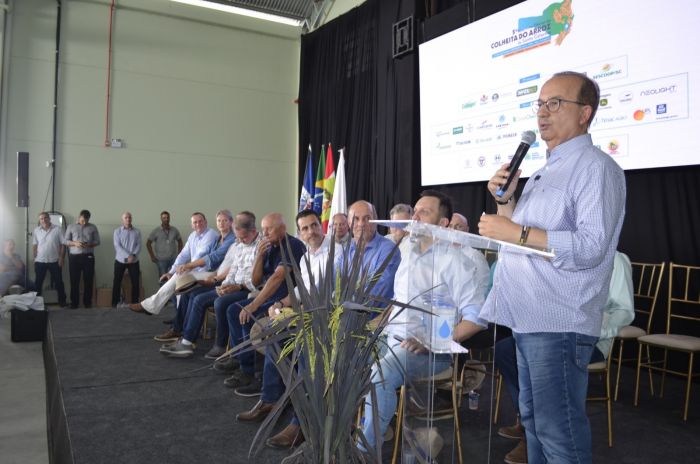 Após a solenidade as autoridades participaram da primeira colheita simbólica de arroz, inclusive com o governador acompanhando o ato de cima da colheitadeira. Feita a primeira colheita algumas autoridades se posicionaram em um espaço para receber “um banho” com os grãos recém colhidos.