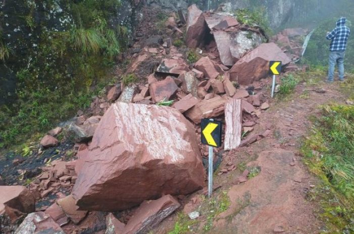 De Urubici até o corte da Serra, o acesso está 100% liberado. Ainda assim, equipes coordenadas pela SIE realizam melhorias no trecho. Foto: Secom/SC Equipes coordenadas pela Secretaria de Estado da Infraestrutura e Mobilidade de Santa Catarina retomaram os trabalhos na Serra do Corvo Branco nesta segunda-feira, 30, onde as chuvas do fim de semana resultaram em um novo desmoronamento. Dessa vez, a queda de uma grande placa rochosa ocorreu em um ponto que já estava mapeado como de risco e que passaria por testes de pulsão nesta semana. Com a previsão de mais chuvas para os próximos dias, não estão descartados novos deslizamentos e descolamento de rochas na área.