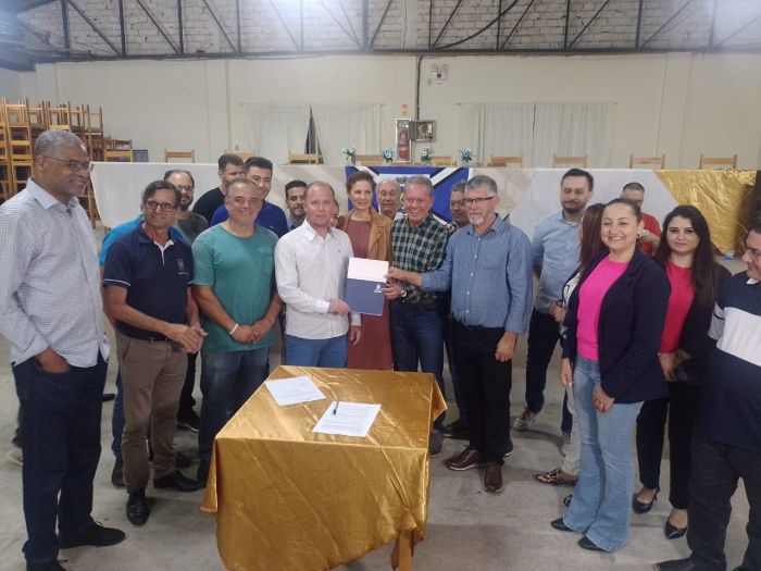 O ato de entrega da ordem de serviço aconteceu no salão paroquial da Igreja Santo Anjo da Guarda e reuniu moradores, lideranças políticas, empresários e a família do saudoso vereador Edison Fernando Peicher de Carvalho, nome oficial da ponte.