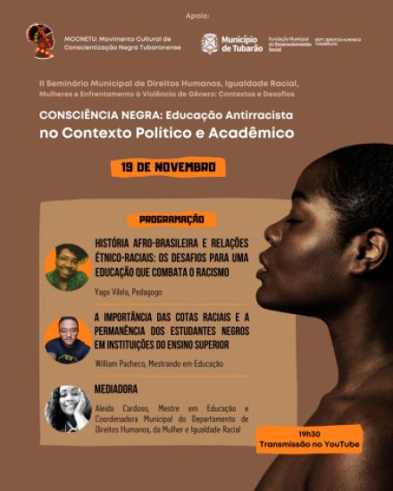 Hoje será executado pelo MOCNETU, em parceria com o Departamento de Direitos Humanos, Mulher e Igualdade Racial, da Fundação Municipal de Desenvolvimento Social (FMDS), uma série de diálogos sobre uma educação antirracista na academia e em instituições de ensino superior, ministrada pelo mestrando em educação Willian Pacheco, além da história afro-brasileira e relações étnico-raciais, envolvendo os desafios para o combate ao racismo, que será mediada pelo pedagogo Yago Vilela. O debate poderá ser assistido a partir das 19h30min, no canal do YouTube do MOCNETU, ou clicando aqui.
