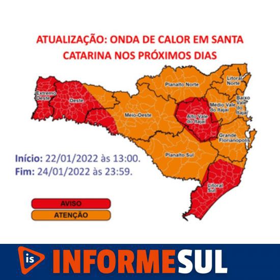 Mapa, elaborado nas cores vermelho e laranja, aponta estado de atenção para o 'calorão' em Santa Catarina até a próxima semana; confira