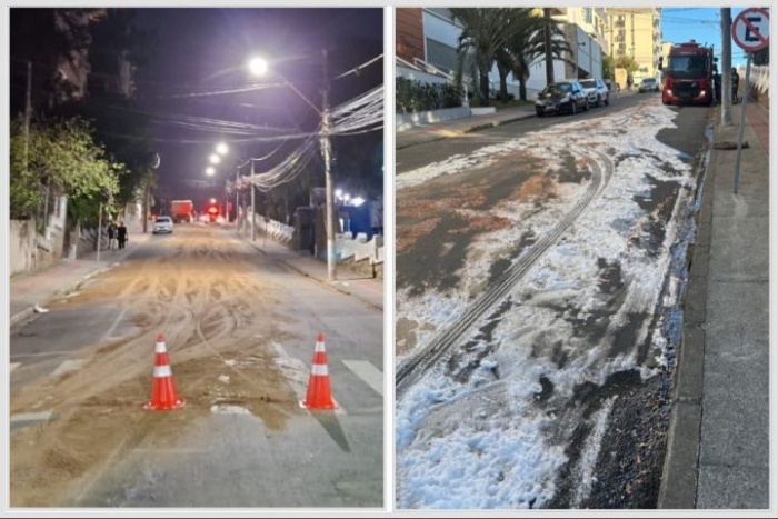 A Rua Felipe Schmidt, no Centro de Tubarão, foi interditada na noite desta terça-feira (29) após um caminhão derramar grande quantidade de óleo no trecho localizado em frente à sede da prefeitura municipal.