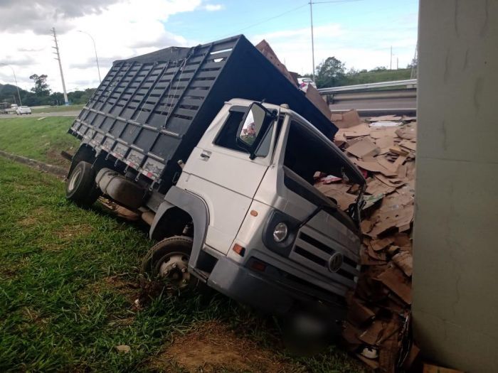 Um caminhão Volkswagen carregado de papelão que perdeu o controle e saiu da pista, segundo relatos havia uma vítima encarcerada.