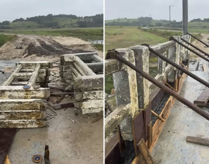 Nesta segunda-feira (20), a empresa responsável pelas obras das pontes na Rodovia Municipal Pedro Rosa Lemos, conhecida como Estrada da Jabuticabeira, foi notificada pela Prefeitura de Jaguaruna por reutilizar guarda-corpos de outras obras, contrariando o contrato que estipulava a instalação de guarda-corpos novos.