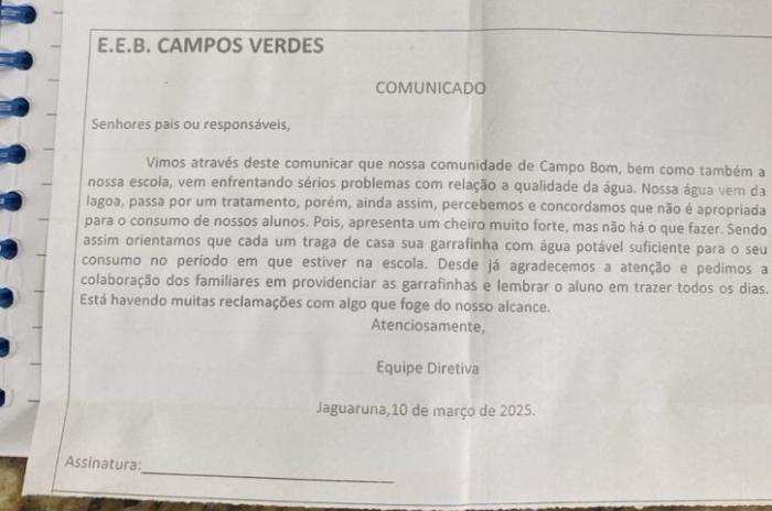 Na última segunda-feira (10), a direção da escola invejou um bilhete aos responsáveis pelos alunos orientando que cada estudante levasse uma garrafa com água potável suficiente para o período escolar.