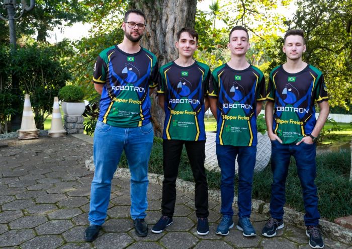 Kamylo Serafim Porto, Kauan Biring Fontanela e Lucas Adriano dos Anjos, junto ao professor Paulo Sérgio Gai Montedo, formam a equipe Robotron-SC. Foto: Julio Cavalheiro / Secom Estudantes catarinenses embarcam, nesta quarta-feira, 6, para a Tailândia com uma grande responsabilidade na bagagem. Kamylo Serafim Porto, Kauan Biring Fontanela e Lucas Adriano dos Anjos, junto ao professor Paulo Sérgio Gai Montedo, formam a equipe Robotron-SC, que irá representar Santa Catarina e o Brasil nas Olimpíadas de Robótica entre os dias 11 e 17 de julho.
