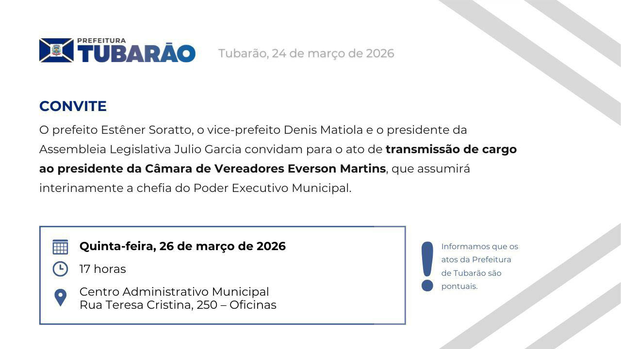O convite para o momento institucional é feito pelo prefeito Estêner Soratto, pelo vice-prefeito Denis Matiola e pelo presidente da Assembleia Legislativa de Santa Catarina, Julio Garcia.