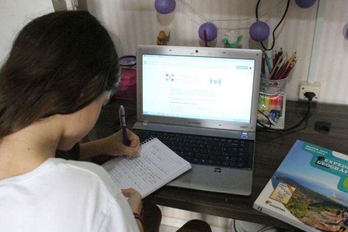 Aulas virtuais. Foto: Imagens da internet Cerca de 500 alunos de 1º ao 9º Ano estudam de forma 100% virtual, por pertencerem a grupo de risco ou por opção dos pais. Já os demais alunos estudam de forma híbrida: em uma semana estão em sala de aula e na outra estão em casa e há ainda o grupo que tem aula integralmente presencial, pois a sala de aula permite o distanciamento de 1,5 metro.