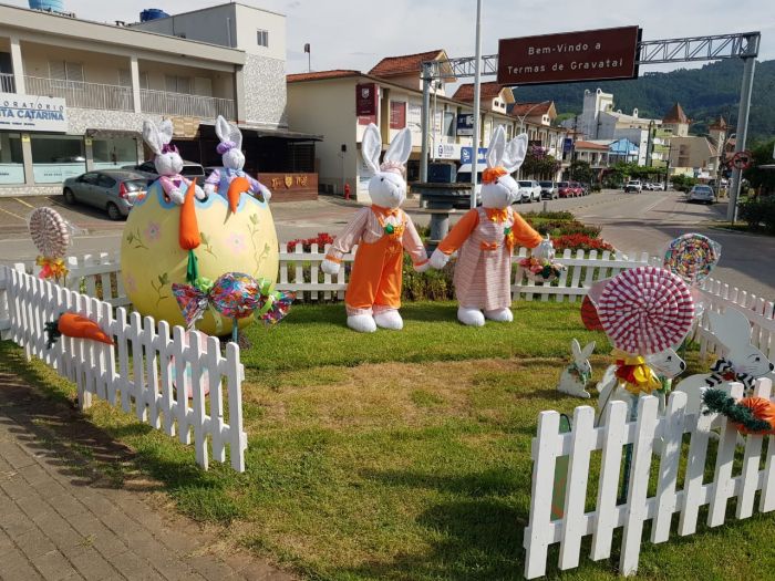 Páscoa. Foto: Prefeitura de Gravatal Nos últimos anos, a Cidade das Águas vem fortalecendo as decorações temáticas em datas festivas afim de proporcionar novas experiências à turistas e visitantes. Este ano, devido a pandemia, a ideia foi oferecer cenários para fotos para que possam registrar sua passagem pela cidade, em clima de páscoa, sem risco de contaminação pelo coronavírus.