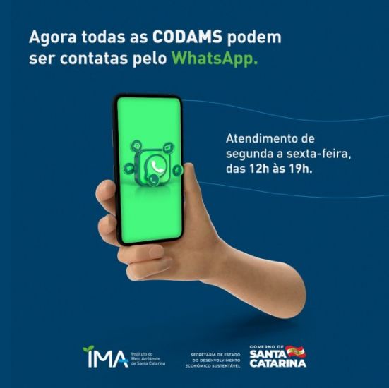 O atendimento via aplicativo funciona de segunda a sexta-feira, das 12 às 19 horas. Foto: Divulgação O Instituto do Meio Ambiente de Santa Catarina (IMA) conta com 16 Coordenadorias de Desenvolvimento Ambiental (Codams) para auxiliar as atividades desenvolvidas pelo órgão em todo o Estado. Cada Codam atende denúncias, fiscaliza, licencia e observa as peculiaridades relacionadas ao meio ambiente.