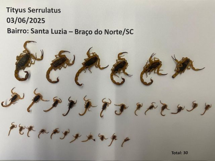 A Vigilância Epidemiológica de Braço do Norte identificou mais 30 escorpiões-amarelos, da espécie Tityus serrulatus, durante um novo mutirão noturno realizado nesta semana no bairro Santa Luzia. Com esse resultado, o número total de escorpiões encontrados na região chega a 92, evidenciando uma situação de infestação preocupante.