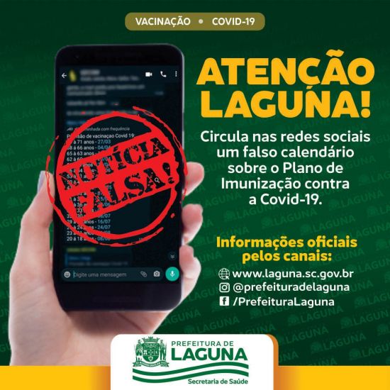 Para estar bem informado sobre as notícias de imunização no município, esteja atento aos portais oficiais da Prefeitura de Laguna, (Site, Facebook e Instagram), onde serão divulgados a programação das vacinas de acordo com a secretaria de Saúde