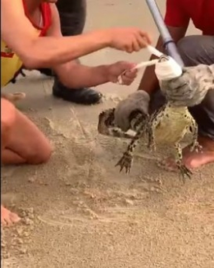Guarda-vidas e bombeiros voluntários agem rápido para proteger banhistas de jacaré encontrado em área de Balneário Paraíso