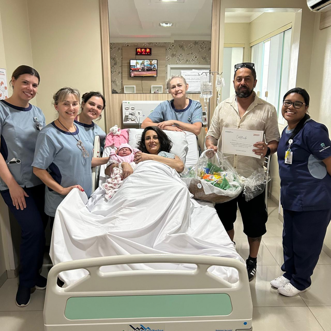 O momento foi celebrado de maneira especial, com a entrega de uma placenta colorida, desenhada por uma equipe de profissionais, e uma cesta de café da manhã à mãe, em reconhecimento à jornada emocional vivida por Waleska e Rodrigo.