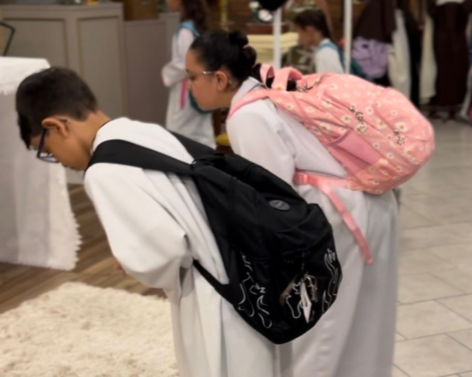 Além dos estudantes, todos os coroinhas e meninas de Santa Teresinha que serviram o altar, desempenharam a função com as mochilas nas costas.
