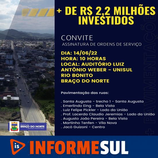 Serão sete ruas autorizadas através de ordens de serviços, sendo que os investimentos ultrapassam os R$ 2,2 milhões. Foto: Arte/PMBN O Município de Braço do Norte lança nesta terça-feira, 14, mais um pacote de pavimentações. Serão sete ruas autorizadas através de ordens de serviços, sendo que os investimentos ultrapassam os R$ 2,2 milhões.