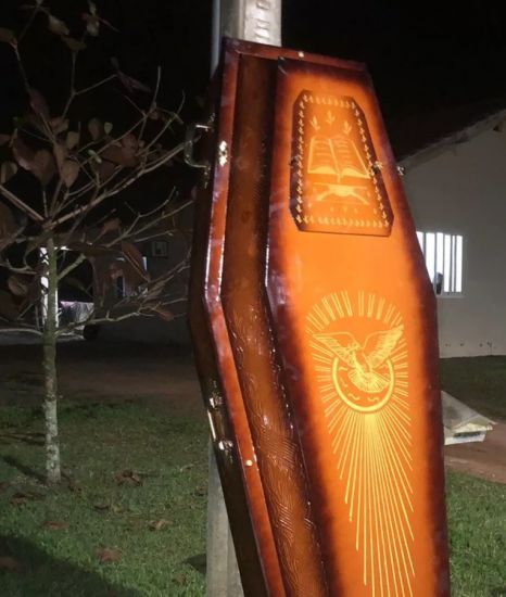 Os agentes encontraram o objeto encostado em um poste na manhã de sábado (2). Para a moradora que chamou as autoridades, o caixão foi deixado como forma de ameaça.