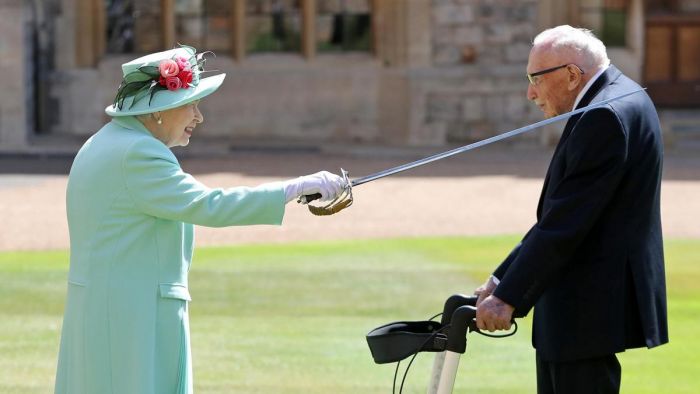 Em julho do ano passado Sir Tom Moore recebeu o título de cavaleiro da rainha Elizabeth II. Foto: Arquivo Veterano da Segunda Guerra, Tom Moore deu voltas em torno de seu quintal e disse que completaria 100 vezes o circuito se as pessoas doassem dinheiro para a saúde pública de seu país. Arrecadou em julho de 2020, 33 milhões de libras (R$ 218 milhões). Por ironia do destino, Sir Moore morreu em decorrência do Covid-19 aos 100 anos. Ele faleceu na manhã de hoje no Hospital Bedford, Moore foi diagnosticado com Covid-19 no dia 22 de janeiro e lutava contra uma pneumonia. O cavaleiro real também fazia tratamento nos últimos anos contra o câncer da próstata e de pele. Como estava internado Moore não havia sido vacinado contra a Covid-19 por causa do outro medicamento que estava recebendo.