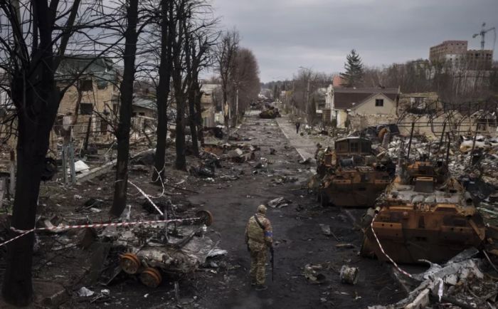 Um militar ucraniano caminha em meio a tanques russos destruídos em Bucha, nos arredores de Kiev, Ucrânia. Foto: Felipe Dana Após o fracasso da ofensiva relâmpago para derrubar o governo da Ucrânia, as forças russas reduziram suas ambições e se concentram na conquista da região do Donbass, onde travam uma guerra de desgaste 100 dias após o início do conflito. A tática de rolo compressor de Moscou para controlar gradualmente o Donbass parece estar dando frutos. Apesar da resistência ucraniana, as forças russas agora controlam uma parte da cidade crucial de Severodonetsk.