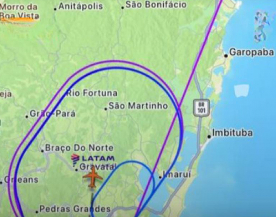 Na foto do radar, é possível acompanhar que a aeronave Latam 3116 realizou várias voltas na região e, enfim, seguiu para o Aeroporto Internacional de Florianópolis.