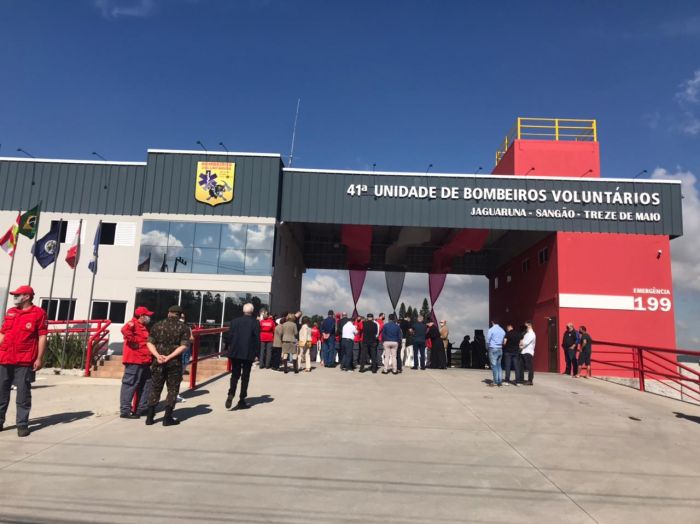 A solenidade contou com a presença da comunidade e autoridades, e seguiu os regramentos contra a covid-19. Foto: BVJ Foi inaugurada a nova sede dos Bombeiros Voluntários de Jaguaruna, Sangão e Treze de Maio no bairro Encruzo, em Jaguaruna, a estrutura física foi concluída em 2020, e já está em funcionamento. O quartel conta com cerca de 700 metros quadrados. A área de atuação da corporação abrange os municípios de Jaguaruna, Sangão e Treze de Maio.