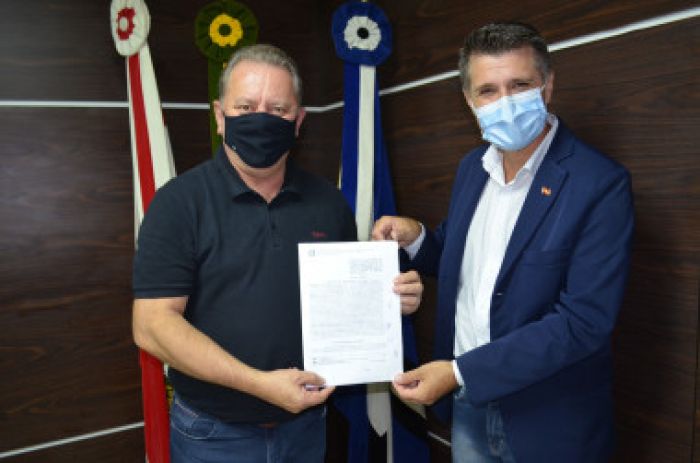 O presidente da autarquia no Estado, Rudinei Luís Floriano, entregou o documento pessoalmente ao prefeito de Tubarão, Joares Ponticelli. Foto: Marcelo Becker/Decom PMT O prefeito Joares Ponticelli recebeu na última semana a confirmação do início das obras do espaço que vai abrigar os serviços de aferição volumétria de veículos-tanque rodoviário (VTR) por parte do Instituto Nacional de Metrologia, Qualidade e Tecnologia (Inmetro). O anúncio foi feito em uma visita ao Paço Municipal pelo presidente da autarquia no Estado Rudinei Luís Floriano.